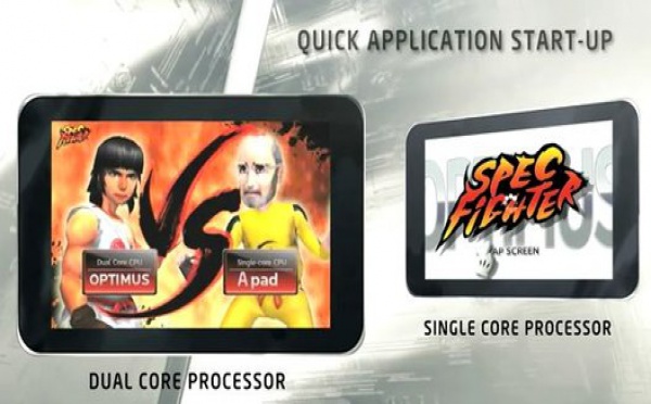 Dans la vidéo de présentation de la LG Optimus Pad, LG n'y va pas de main porte lorsqu'il s'agit de venter la vitesse de leur processeur Dual Core.La preuve à 1,03 mn quand on voit apparaître un certain Steve Jobs ( du moins un sosie ) dans un combat de SpecFighter et évidemment ... Steve Jobs prend une raclée.