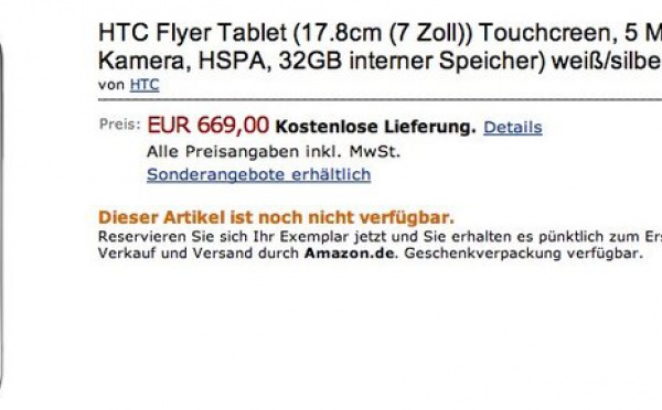 La tablette HTC Flyer, dévoilé lors du MWC, se vendrait au prix de 669 € si on en croit le site Amazon en Allemagne.Si tel devait être le prix, je le trouve personnellement un peu cher, pour une tablette de 7 pouces, surtout quand on pense connaître le prix de la Motorola Xoom qui elle est en format 10 pouces.source