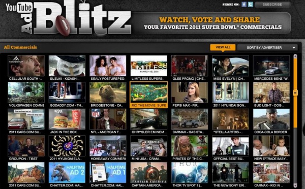 Le Super Bowl 2011 est maintenant terminé et si vous êtes un fan de publicités et vous souhaitiez voir l'intégralité des pub du Super Bowl, alors vous avez rendez sur Youtube, sur la chaine AdBlitz plus exactement.Et si vous décidez de les regarder toutes, n'hésitez pas à faire le calcul du temps total de pub, et de compter...