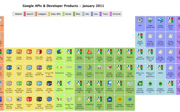 Si vous souhaitez jeter un coup d'oeil aux produits et API de Google, voici une belle représentation tel un tableau périodique des éléments.Et bien ... ça en fait des trucs :)source