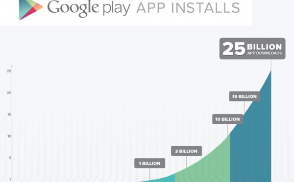 Google a annoncé aujourd'hui avoir dépassé les 25 milliards de téléchargements d'applications sur son store, Google Play. De plus, Google annonce également qu'il y a aujourd'hui 675000 applications sur Google Play. Tous ces chiffres ont considérablement augmenté depuis la conférence Google I/O qui a eu lieu en juin dernier...