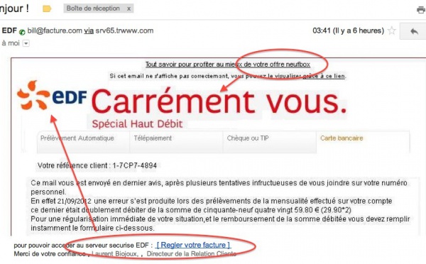 Dans la série des arnaques par mail, tentavives de phishing et autres curiosités du genre, voilà le mail que j'ai reçu hier dans la journée. Ce coup ci, on pousse la débilité à son plus haut niveau, comme vous pourrez le voir sur l'image, en mélangeant du EDF et du SFR. En clair, on vous parle de votre neufBox, avec un bon...