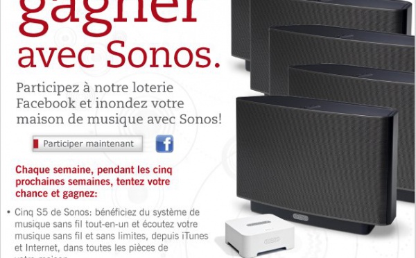 Si vous avez lu mon billet à propos du matériel Sonos, voilà un super cadeau que vous offre SONOS.Pendant 5 semaine, Sonos offre 5 S5 et 1 ZoneBrige ( 1 lot complet par semaine ) et tout ça se passe sur Facebook.Qui ne tente rien n'a rien, alors tentez votre chance :)