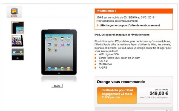 Comme je vous en avais parlé hier , Orange devait proposer aujourd'hui son offre iPad à 149€. Et bien c'est chose faite, l'iPad WiFi + 3G 16Go est proposé à 249€ moins une offre de remboursement de 100€ soit 149€. Bien sûr il faudra vous engager pendant 2ans avec un forfait de minimum 31€/mois.Encore un bon moyen pour écouler...