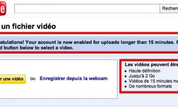 Youtube vient d'allonger la durée des vidéos de 10 à 15 mn, pour des vidéos de 2 Go maxi.Cette possibilité de durée, offerte jusqu'à présent à quelques rares privilégiés, commence visiblement à s'étendre puisque le screen que vous voyez ci dessus provient de mon propre compte Youtube.Je suppose donc que nous devons être...