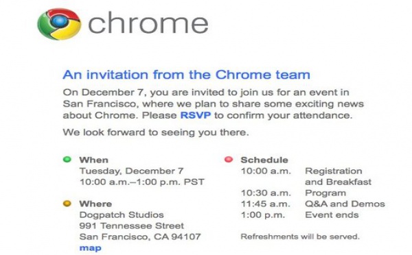 Google a envoyé des invitations à une conférence de presse qui se déroulera à San Francisco le mardi 7 décembre 2010.L'invitation dit : " Nous avons l'intention de partager de bonnes nouvelles sur Chrome ".Et comme les rumeurs de sortie de Chrome OS se font de plus en plus pressantes, et qu'il est même question que Google sorte...