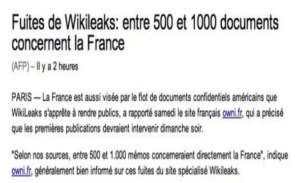 Selon l'AFP et du site Ovni.fr, Wikileaks, qui s'apprête à publier de très nombreux documents, on parle de 7 fois plus que les 400 000 documents concernant la guerre en Irak, pourrait également faire tremble l'Elysée.En effet, il paraîtrait que 500 à 1000 documents concerneraient la France.Ces documents devraient être publiés...