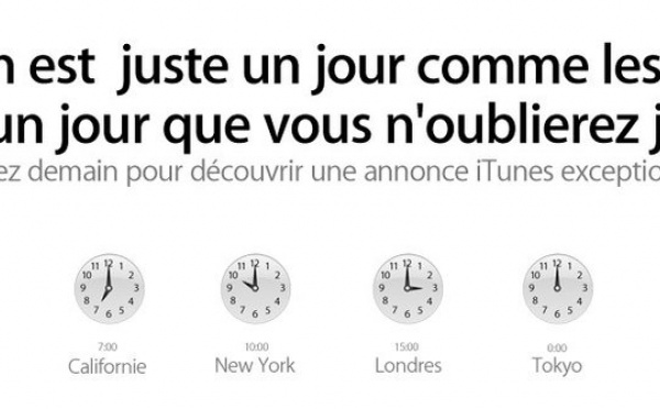 Update: Fin du Teasing, ce sont les Beatles qui sont maintenant sur iTunes , du moins l'intégrale ;)Demain, à 16h heure française, une grosse annonce sera faite sur iTunes.A l'heure ou tout le monde attend l'iOS 4.2 sur son iPhone ou son iPad, c'est iTunes qui sème le trouble avec ce teasing " Demain est un jour que vous...