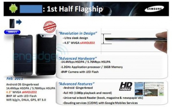 Non il ne s'agit pas d'un Google Nexus S, allias Samsung GT i9020 mais bel et bien d'un tout nouveau Samsung aux caractéristiques très alléchantes, qui devrait sortir en Février 2011, voyez plutôt écran 4,5 pouces Super Amoled 2 APN 8 Mpixels avec Flash Led avec capture vidéo en 1080 p 16 Go de mémoire processeur...