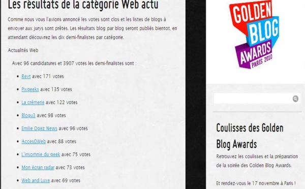 Le vote du public pour les Golden Blog Awards, AccessOWeb a été inscrit le 31 octobre, près d'1 mois après le démarrage et AccessOweb se retrouve dans la liste des 10 demi-finalistes de la catégorie " Actualités Web ".Je voulais donc, par ce message, remercier toutes et tous ceux d'entre vous qui ont voté pour le blog.Cette...