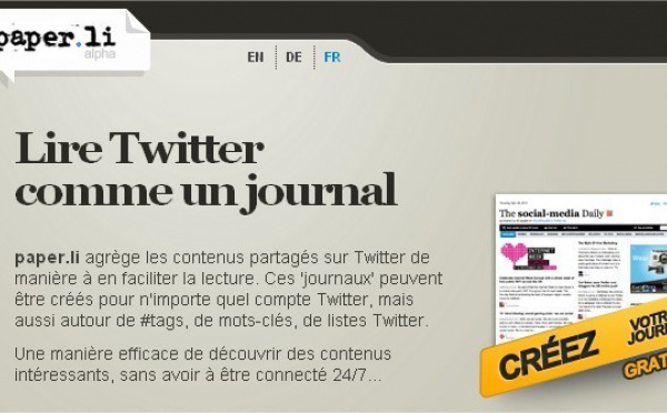 Paper.li, que de très nombreux utilisateurs de Twitter connaissent déjà dans sa version anglaise, est maintenant disponible en français, en allemand et très prochainement en espagnol ( semaine prochaine ).Paper.li est permet à qui le souhaite de créer une sorte de journal avec du contenu agréger depuis Twitter, soit via des...