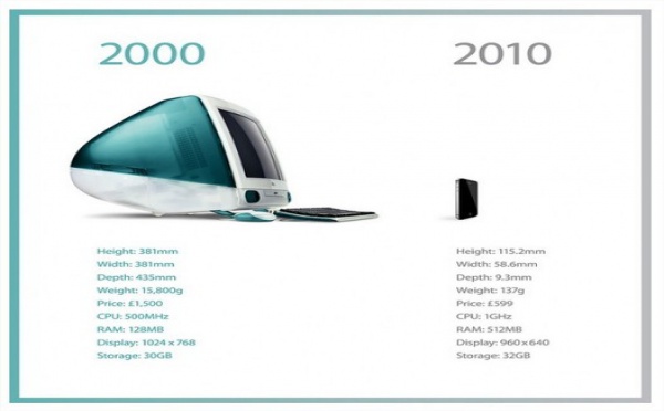 Enfin une machine Apple bien sur :)C'est marrant de regarder l'évolution des technologies dans ces 10 dernières années ( oui remonter plus loin serait de la torture :) ) et lorsqu'on regarde par exemple ces 2 machines Apple, on s'aperçoit nettement de cette évolution surtout en matière de miniaturisation :)source