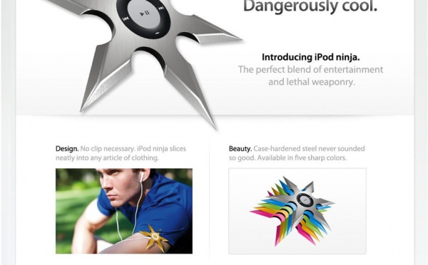 Steve Jobs s'est fait arrêté, en début de mois, dans un aéroport avec une étoile de Ninja dans les bagages et une vrai fausse rumeur lancée par Scoopertino parlait du prototype d'un nouvel iPod, l'iPod Ninja.Très classe cet iPod Ninja, il faut le dire mais attention tout de même ... ça pique :)