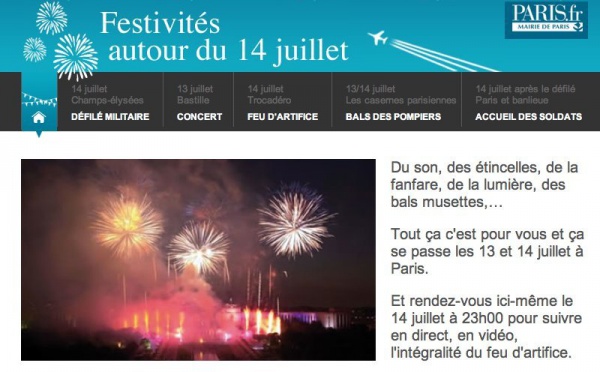 Edit: le 14 juillet 2012, suivez le feu d'artifice de Paris en direct Live La mairie de Paris a mis en place un site internet afin de retransmettre en direct tous les évènements du 14 juillet 2010. A cette occasion, sur le site 14juillet.paris.fr vous pourrez suivre le Feu d'Artifice du 14 juillet à Paris en...