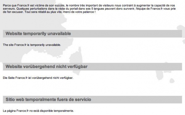 Hier je voulais faire un petit billet de présentation de France.fr, le nouveau portail français, traduit en 5 langues, sensé représenter la France. Le beau temps ( du sud ;) ) m'a convaincu de faire autre chose :)Et voilà qu'aujourd'hui France.fr est down.Et oui, France.fr est victime de son succès, un jeudi, à 7h du matin,...