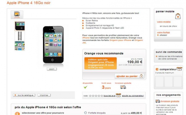Orange vient d'ouvrir officiellement sur son site les commandes pour le nouvel iPhone4. Pour la version 16 Go Noir, l'appareil est vendu à 199€ et livré sous 3 jours avec un forfait Origami à 55€/mois pendant 2 ans. Il faut par contre être patient, le site rencontre en ce moment une grosse surcharge.
