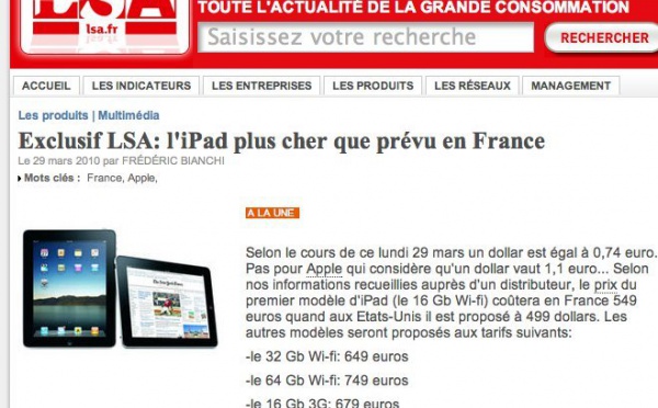 Le site LSA affiche une exclusivité sur les prix de l'iPad qui vient confirmer ce que l'on savait déjà par le site Allemand .Donc, si l'iPad 16 Go WIFI se vend à 549 €, nous subirons donc une hausse de 50 € par rapport aux tarifs habituels qui sont fait selon le calcul 1$ = 1€Tout ceci demande confirmation bien sur,...