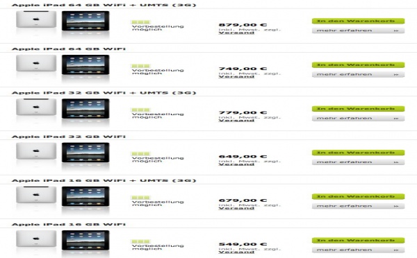 Voilà, selon une rumeur propagée par 3Gstore.de, les tarifs de l'iPad en Europe.Comme vous pouvez le voir, ce coup ci, 1$ n'est plus égal à 1€ ( ce qui est déjà dur à avaler ), mais on a l'impression que le $ a pris un envol car le prix annoncé c'est donc : 1$ = 1€ + 50€