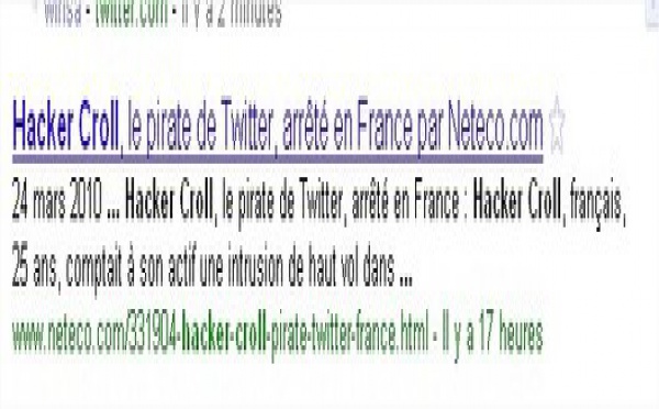 Désolé pour les confrères ( je peux dire ça hein? ) de Neteco, mais je ne peux pas m'empêcher de faire un petit billet humoristique sur le titre de leur article à propos de l'arrestation de François, allias Hacker Croll apparu dans Google.En effet, comme vous le voyez sur l'image, on a nettement l'impression que c'est Neteco...