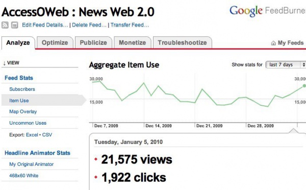 La courbe ci-dessus correspond à aux flux RSS d'AccessOWeb et on peut voir combien de vues cela fait journalièrement et bien sur, cela fluctue en fonction de la fréquence de publication.Sur le flux d'AccessOWeb, il y a un peu de pub Google Adsense, mais celle-ci ne rapporte rien, ce qui est normal me direz vous, les...
