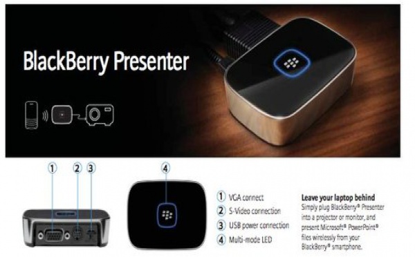 Le CES 2010 a commencé, du moins les premières informations commencent à tomber suite à des conférences de presse.Là il s'agit de Blackberry qui vient de présenter le Blackberry Presenter, un petit boitier qui peut se relier à un vidéo projecteur via S-Video ou VGA et qui permet de projeter des documents, présentations, etc ......