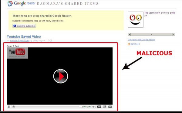 Selon Trend Micro, le virus Koobface se baladerait sur Google Reader et infecterait les utilisateurs par le biais d'une fausse image ressemblant à une animation flash qui, lorsqu'elle est cliquée, amène l'utilisateur sur une fausse page de Youtube qui héberge le virus ( download automatique )