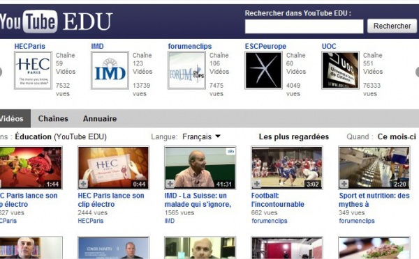 Youtube a mis en ligne une chaine spécialement consacrée aux universités : Youtube EDU On y retrouvera quelques grands noms d'universités françaises comme HEC, Siences PO Paris, EM Lyon, etc ... mais également des universités du Royaume Unis, Espagne, Italie, Russie, Israël et Pays Bas.Youtube EDU...