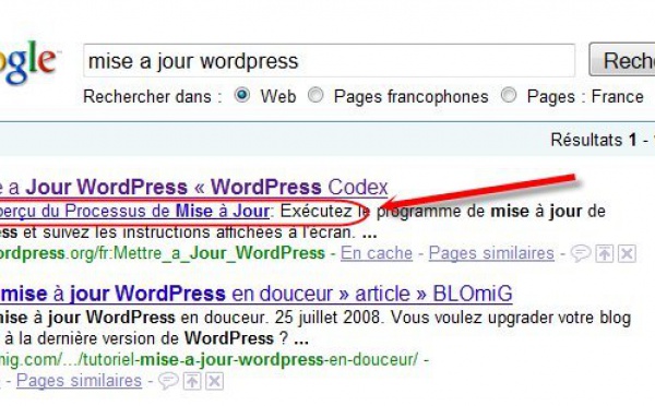 C'est mon ami Weetabix qui m'a montré cette recherche, et je dois avouer que c'est la première fois que je constate ceci.Sur la recherche : " mise à jour wordpress ", on voit dans le premier site, un lien dans la description qui mène directement à un ancre sur la page.Je ne sais absolument pas si c'est une pratique courante,...
