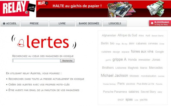Relay, spécialiste de la presse en ligne, a mis en ligne un nouveau service le 9 septembre dernier ( je suis un peu en retard et pourtant on m'avait prévenu )Ce nouveau service ce sont les Alertes Presse.En clair, vous tapez des mots, ou des combinaisons de mots, et Alertes Presse de Relay vous sort tous les magazines dans...