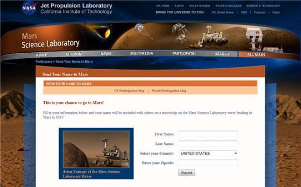 La NASA propose aux internautes d'envoyer leurs identités sur la planète MARS sur une puce électronique lors de la future expédition " Mars Science Laboratory Rover " en 2011. Pour cela, direction le site de la NASA ou vous inscrirez vos noms, prénoms, pays et code postal et on peut voir sur la carte mondiale qu'il y a du...