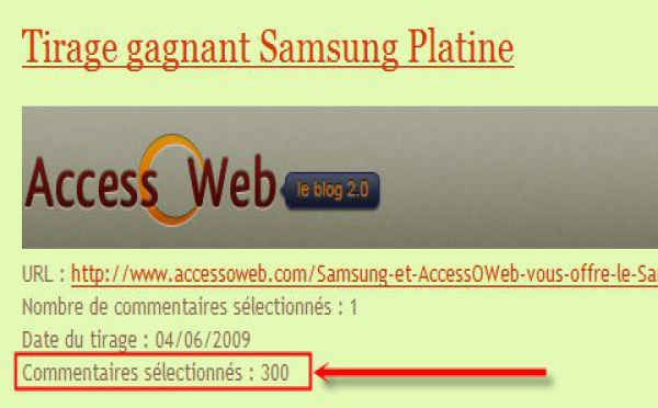 Voilà, le gagnant du Samsung Platine proposé dans ce billet est déterminé Comme vous pourrez le vérifier sur le site du tirage au sort, le gagnant est le commentaire 300 Je transmet un mail au gagnant très rapidement. Merci de votre participation ( 356 participants ).