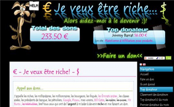 Alors que l'économie part en c.... et que les entrepreneurs se bougent dans tous les sens pour faire vivre leur entreprise, en voilant un qui tente d'inventer un nouveau métier : Cyber Mendiant , qui est aussi son pseudo qui traine ça et là sur le Web. Et il en a fait un site : Je veux devenir riche Bon courage :)