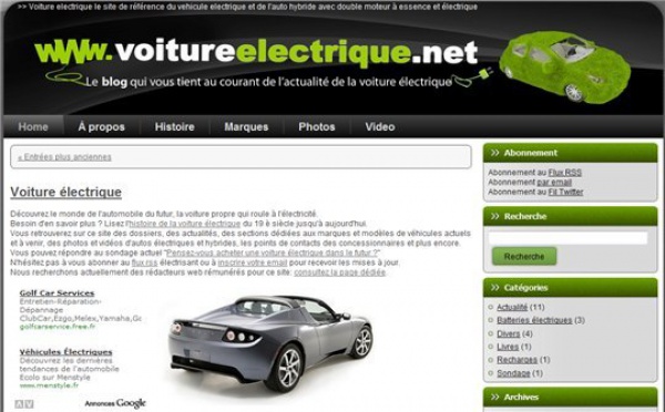 Voiture Electrique.net est un nouveau blog lancé notamment par notre ami Vincent Abry. Ce blog collaboratif traite évidemment des voitures vertes, électriques ou hybrides et vous y retrouver l'histoire de la voiture électrique, les principales marques ainsi que des photos et des vidéos. Voiture Electrique cherche...