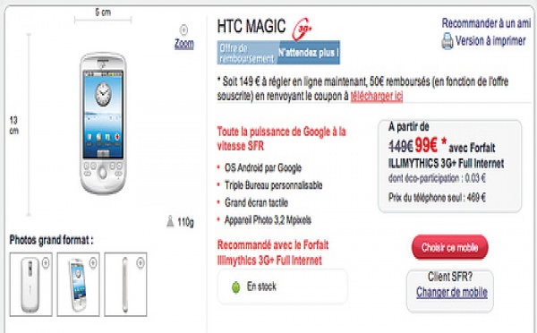 Comme signalé le 27 avril, le HTC Magic est en vente chez SFR. depuis aujourd'hui au prix de 99 Euros avec un forfait illimythics 3G+ Full Internet