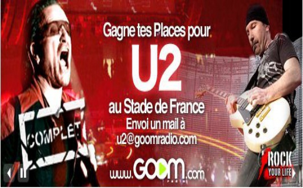 Goom Radio, que vous connaissez tous déjà, lance un jeu qui va vous permettre de gagner des places de concert pour aller voir U2 au Stade de France les 11 et 12 Juillet 2009 ( pour l'histoire le concert est complet ) Pour gagner, c'est simple, il suffit d'écouter la radio Rock Your Life sur Goom Radio et dès que vous entendez...