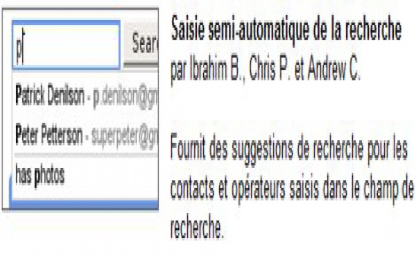 Une petite nouveauté a fait son apparition sur Gmail Labs aujourd'hui, la saisie semi automatique dans la zone de recherche ou la suggestion de recherche. Si vous activez le module ( photo ci dessus ) alors vos recherche de personnes ou de documents pourra être facilitée dans Gmail. Par exemple, le fait de taper 2...