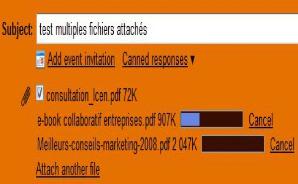 Comme annoncé sur le blog de Gmail, et aussi sur de nombreux blogs, Google a ajouté une fonction permettant l'envoie de multiple pièces jointes en une seule sélection sur Gmail. On peut donc maintenant , après avoir sélectionné plusieurs pièces, voir une barre de progression d'upload s'afficher sur Gmail. Dans un même...