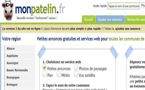 MonPatelin, après 2 ans d'existence et des centaines d'heures de développement par son créateur, vient de passer en version 3, ou version finale. MonPatelin propose un service de petites annonces gratuites dans les différentes communes de France dans des catégories variées ( auto-moto(, immobilier, animaux, emploi, entraide,...