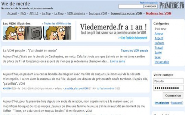 Vie de Merde, ou VDM pour les intimes a 1 an aujourd'hui et leurs créateurs Maxime, Guillaume et Julien reviennent sur la merveilleuse année qu'il viennent de passer dans un billet sur le blog de VDM pour célébrer ces 1 an d'existence. Entre pub radio, et plateau télé, VDM est devenu en France une petite institution...