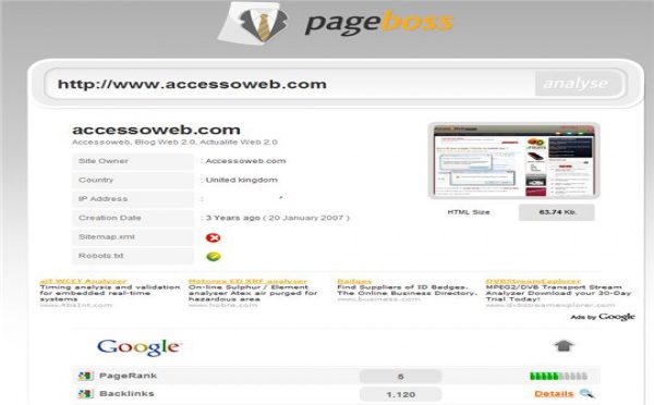 PageBoss propose d'analyser ( c'est un grand mot quand même ) les sites Web et de vous donner différents résultats selon différents moteurs comme google, Yahoo!, Dmoz, Technorati, Twitter, etc ... Pour chacun des résultats vous pourrez voir les détails en cliquant sur le lien vous renvoyant directement sur le moteur...