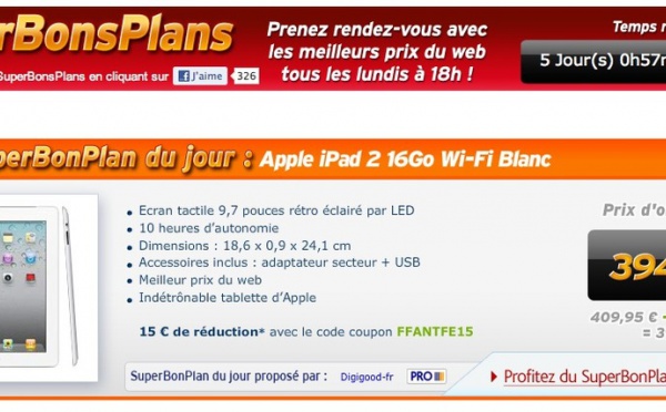 Presque 100 € de réduction sur l'iPad 2 16 Go WIFI chez PriceMinister aujourd'hui, et ce jusqu'à 22h seulement, voilà ce que l'on peut appeler une "ristourne" sympathique pour les amateurs de tablettes qui hésitaient encore à s'en acheter une. Bien sur, il plane sur la petite sphère techno Geek que Apple se préparerait à...