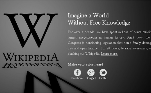 L'image ci-dessus représente la home page de Wikipedia US, qui, comme beaucoup d'autres, ont décidé de fermer leur site pendant une journée afin de protester au projet de loi SOPA (Stop Online Piracy Act) déposée au mois d'Octobre dernier à la Chambre des Représentants. Toutes les grandes enseignent américaines se sont unies...