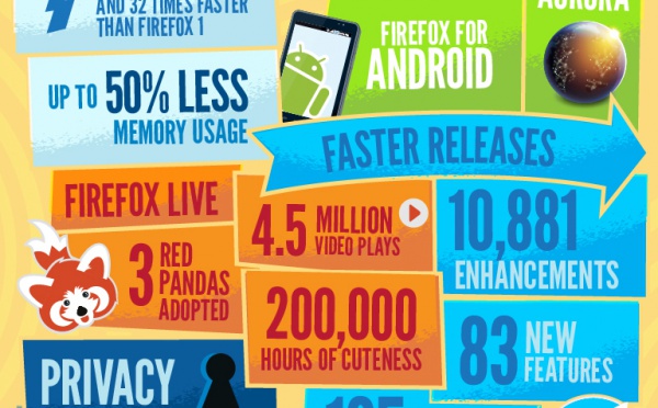 Firefox a continué de faire parler de lui en 2011, en premier lieu pour la fréquence de mises à jour du célèbre navigateur. Mozilla propose une infographie pour parler de Firefox, ce qui permettra à certain d'en apprendre un peu plus sur la dernière version du navigateur. L'occasion de faire un retour en arrière en lisant que...