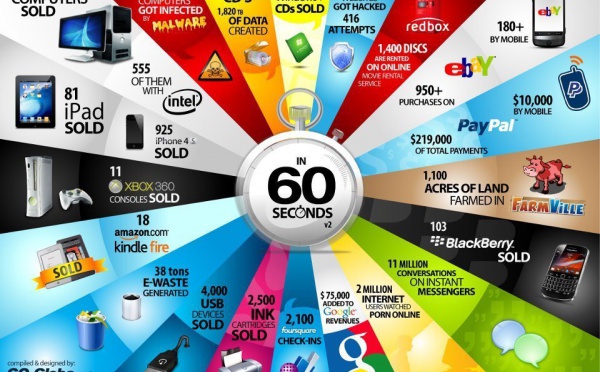 C'est fou ce qu'il peut se passer sur Internet en 60 secondes, surtout dans le monde technologique... Pendant que Apple vend 925 iPhones et 81 iPad, Amazon vend 18 Kindle Fire, Microsoft écoule 450 CD de Windows 7et 11 XBOX 360, Blackberry continue de vendre 103 Blackberry Bold et... Google engrange quelques 75000 $ de...