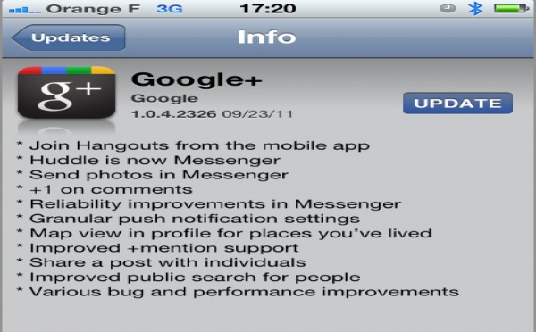 L'application Google Plus pour iPhone a été mise à jour et parmi les nouveautés, nous retrouvons : Ajout de +1 aux commentaires personnalisation du push visualisation des lieux visités sur une carte Huddle devient désormais Messenger envoie de photos via Messenger partage d'un post conférence...