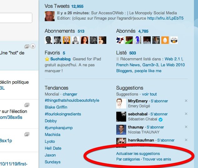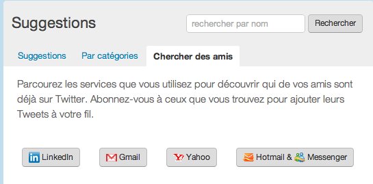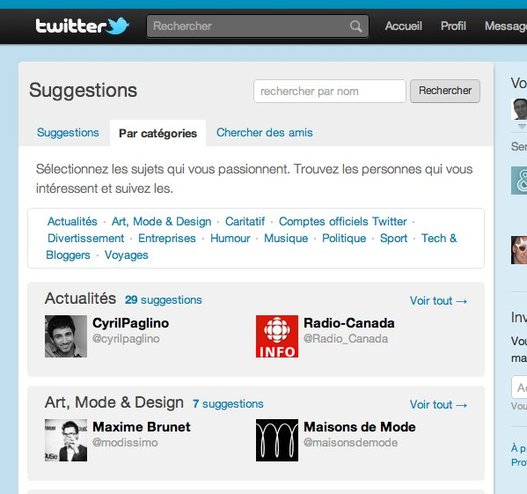 Hier encore, lorsqu'on allait sur Twitter ( version Web ) on pouvait voir des suggestions d'abonnements dans la colonne de droite. Aujourd'hui, ces suggestions se sont un peu étoffées en laissant place à un service beaucoup plus complet . ( qui devrait donner lieu à l'apparition d'un nouvel onglet " personnes ' dans le menu de Twitter )