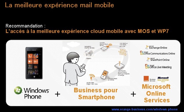 Orange profite de ces forfaits "tout compris" pour proposer aux posseseurs de Windows Phone, l'utilisation de MOSS (Microsoft Office SharePoint Services) avec leur forfait. Pour ceux qui ne connaissent pas MOSS c'est tout simplement le Cloud par Microsoft réservé aux entreprises pour héberger des sites collaboratifs ou bien des documents.