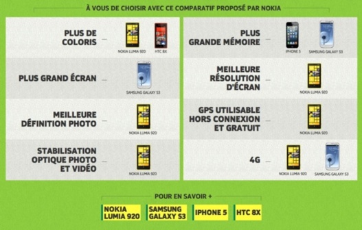 Il n'empêche que le comparatif en question, proposé par Nokia, compare le Lumia 920 (notre test) , le Samsung Galaxy S3, l'iPhone 5 et le HTC 8X , ces 4 mobiles étant les fleurons actuels des différentes marques.