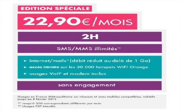 Nous avions évoqué le futur forfait de Sosh en édition limité et nous en savons un peu plus aujourd'hui. A partir du jeudi 15 décembre 2011, Sosh proposera un forfait à 22,90€ composé de : 2h d'appel SMS et MMS illimité 1Go pour l'accès internet avec débit réduit au delà à 128Kb/s usage Modem et VOIP inclus...