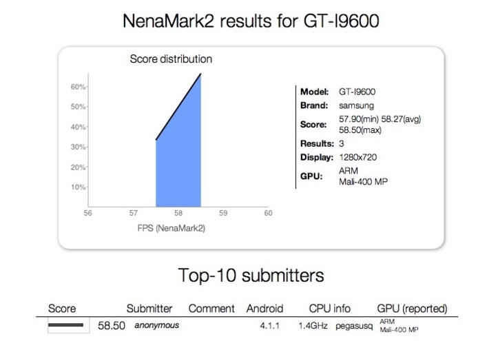 L'appellation GT-I9xxx correspond à la gamme des Galaxy S mais on se demande s'il ne s'agit pas tout simplement d'un Galaxy S3 tournant sous Android 4.1.1 pour préparer la mise à jour vers le nouvel Android. Les résultats NenaMark2 pouvant être facilement truqués, apparemment.